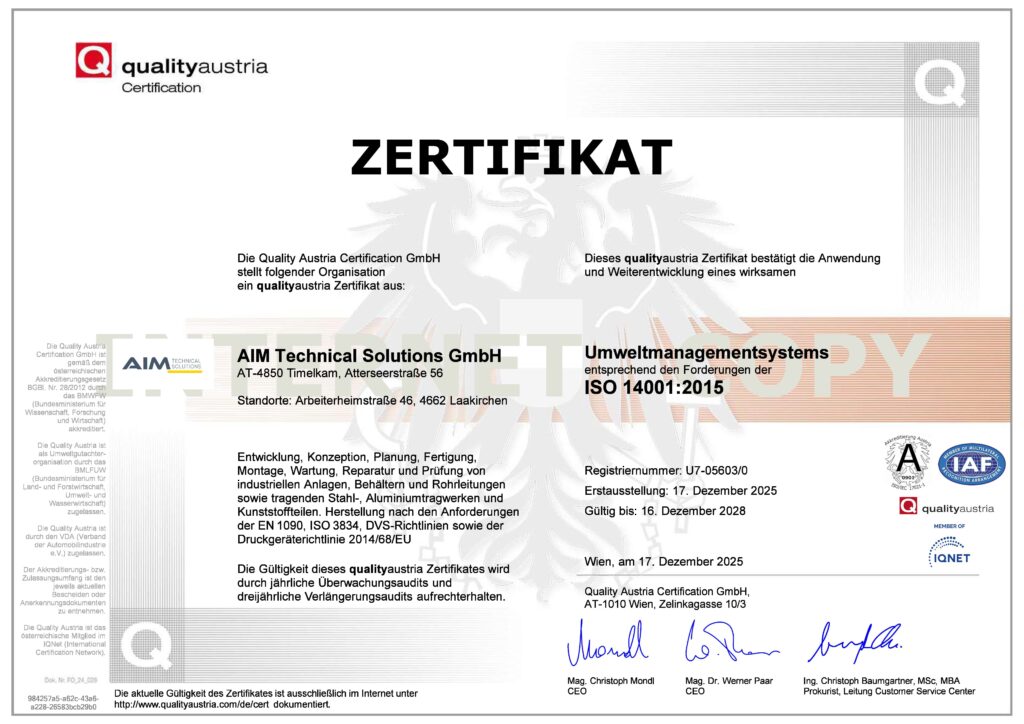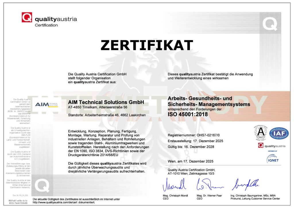 Die AIM Technical Solutions erfüllt nun auch offiziell die Anforderungen der ISO 9001, ISO 14001 und ISO 45001. Damit bestätigen wir: