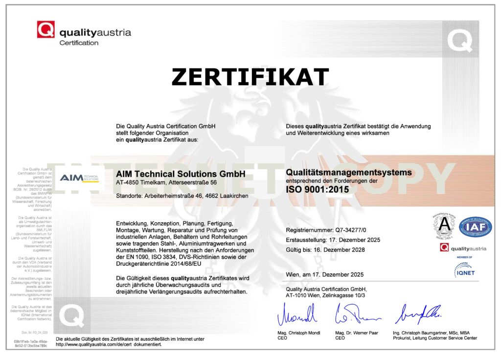 - Qualität: strukturierte Prozesse in Entwicklung, Fertigung und Montage, Prüfungen sowie Reparaturen – inklusive Erfüllung von EN 1090, ISO 3834, DVS und der Druckgeräterichtlinie.